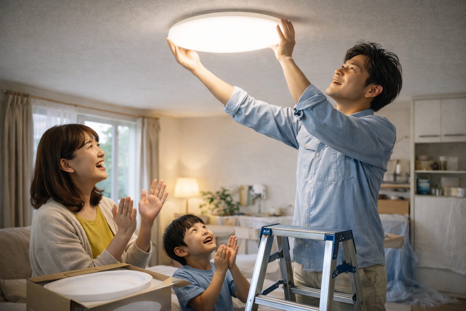 多くの家庭の天井には「引掛シーリング」という器具がついており、新しいLEDシーリングライトをカチッと回すだけで自分で取り付けられます。 工事業者を呼ぶ必要がないので、2027年の「予約が取れない・工事費が高騰する」問題をまるごと回避できます。