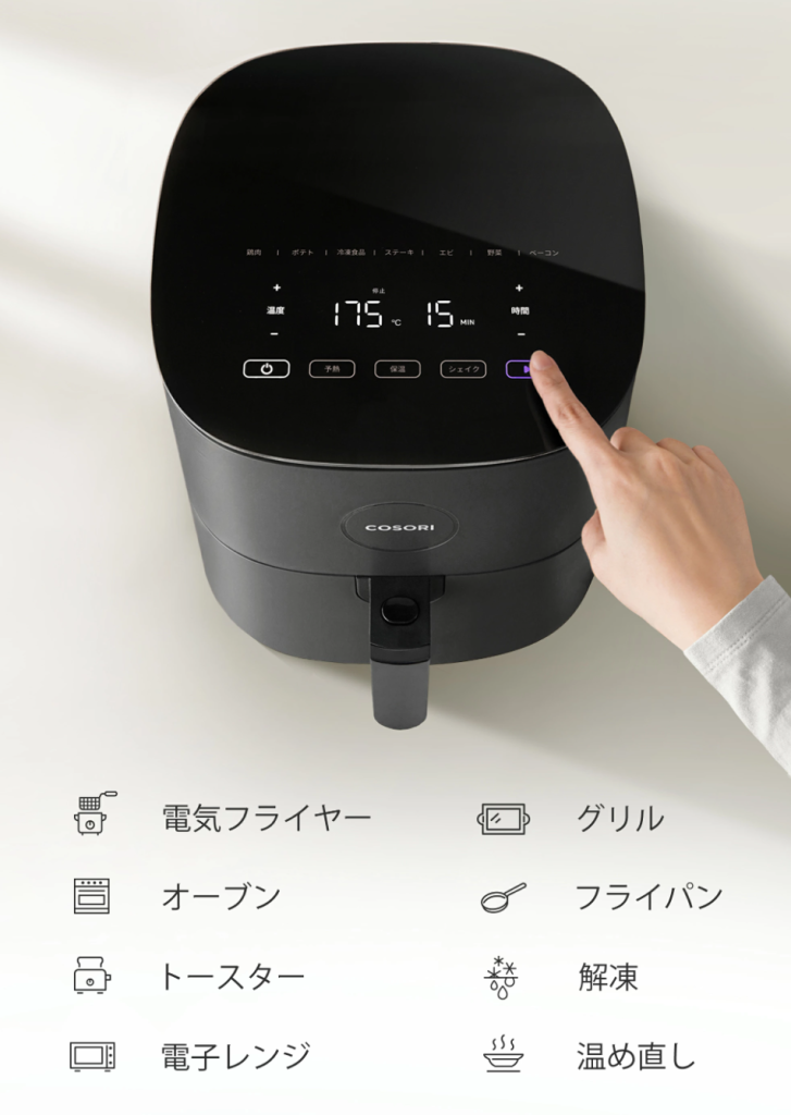 | 少量の油で健康的な調理を実現し、しかもカロパが良く、揚げ物から焼き物、ドライフード、ベイク、ロースト、グリル、保温、解凍、再加熱、発酵までさまざまな料理が可能。 |