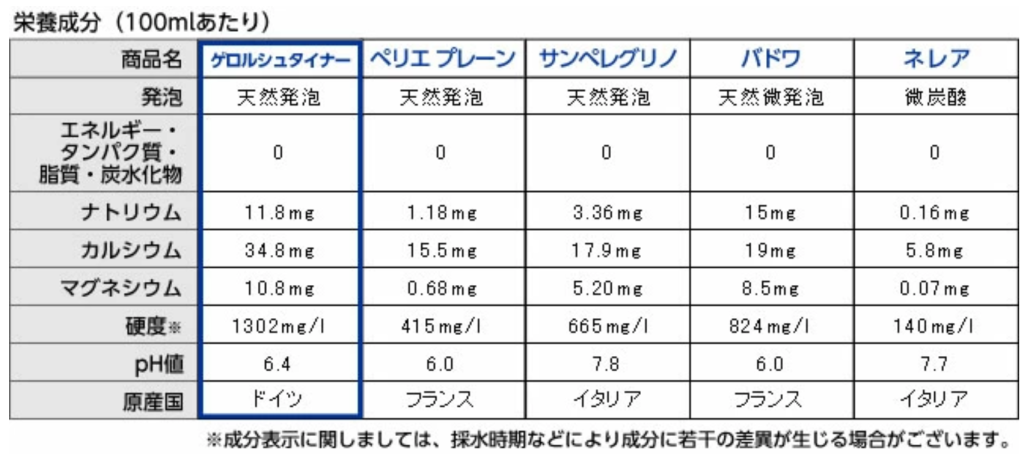 ゲロルシュタイナー(GEROLSTEINER)はドイツ西部のゲロルシュタインで採水されていて天然の炭酸水でしかも高度が高く、カルシウムなどの天然ミネラル成分を多く含んでいるよ。