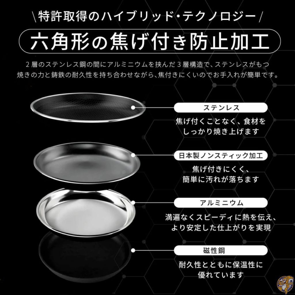 ステンレスの耐久性とノンスティックの使いやすさを融合した六角形構造が特徴で、鉛・カドミウム・PFAS・PTFEといった有害物質を一切使用していない、安心・安全につかられています。