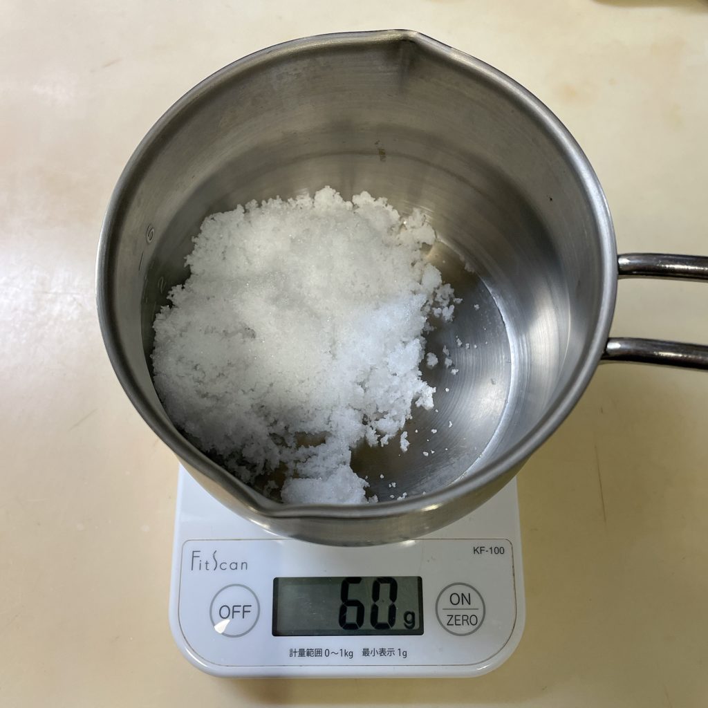 熱湯に60gの塩を加えてよく溶かし、60℃程度まで冷まします。