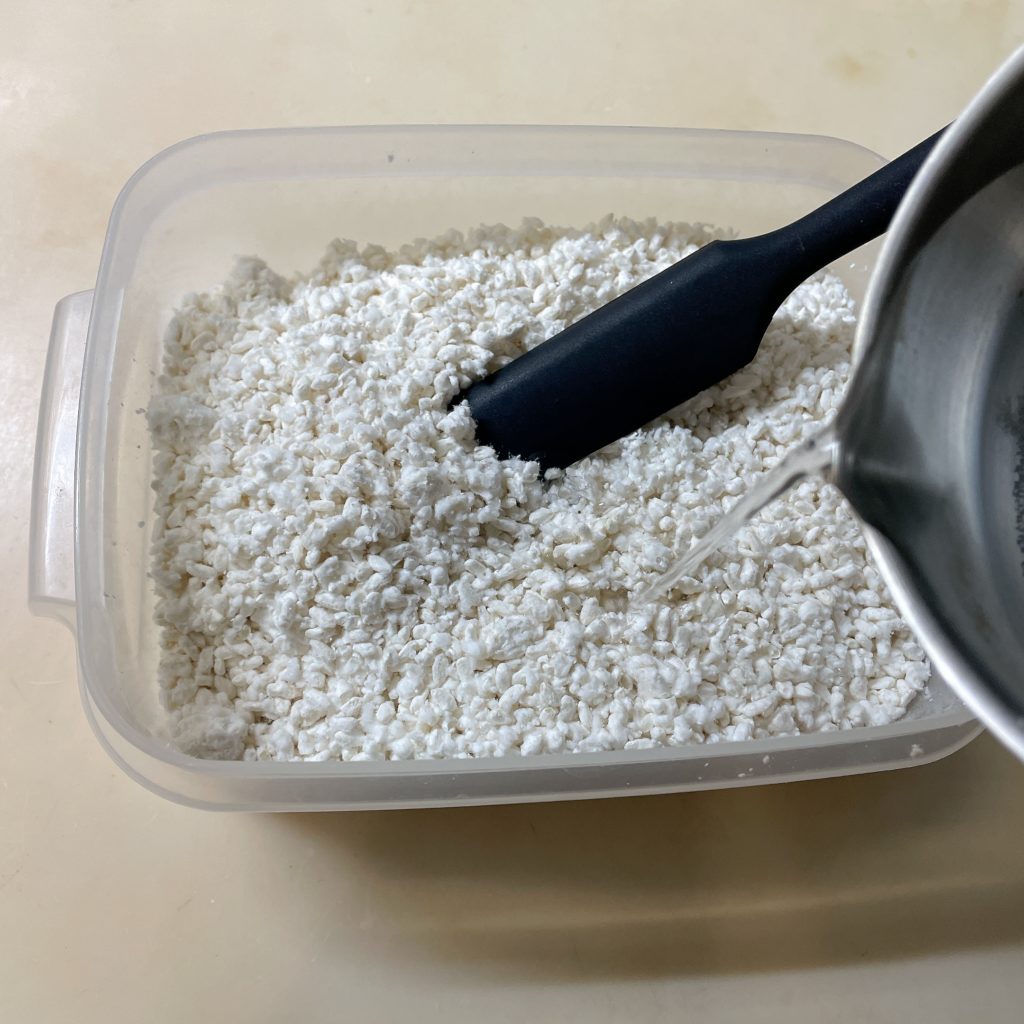 麹を袋の中で手でもみほぐし、ポロポロ状にしておく。
