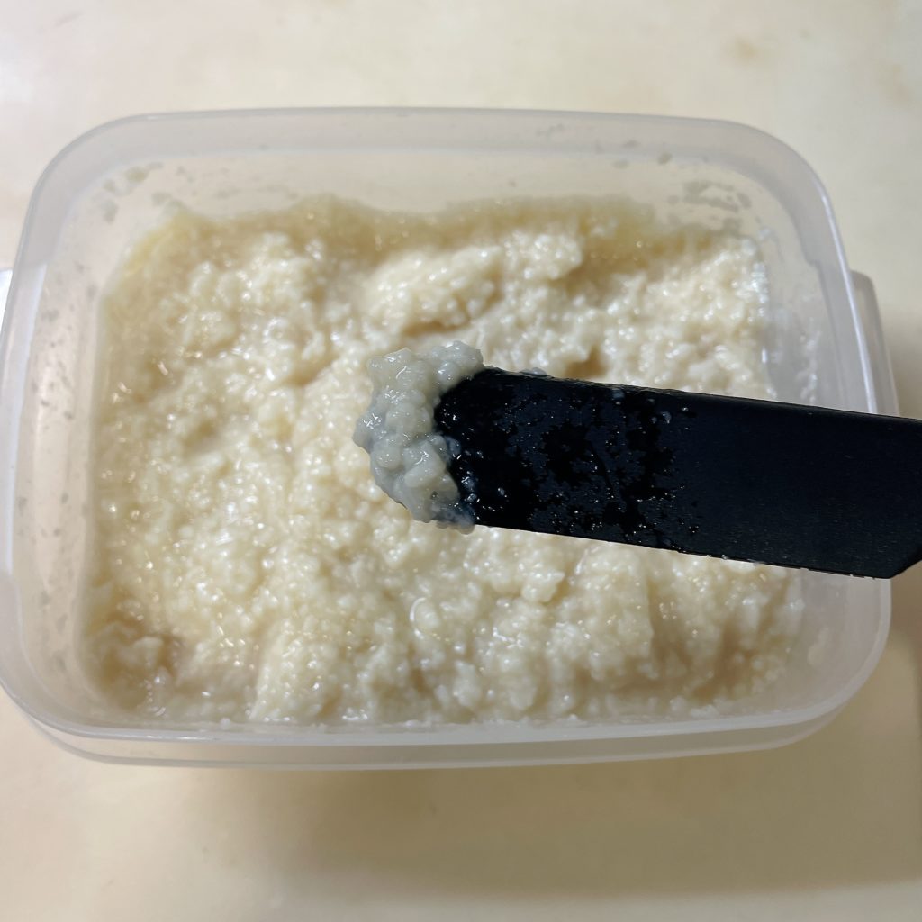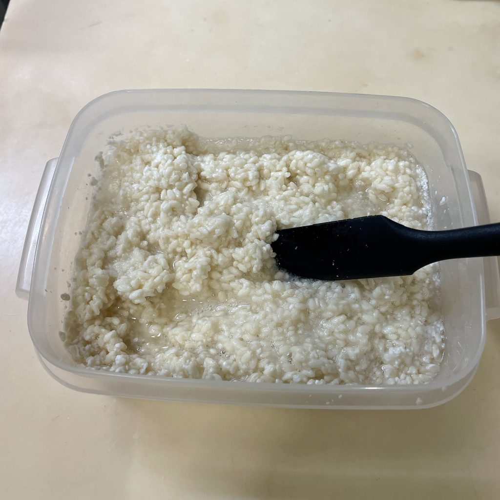 全体にとろみが出てきたら発酵が進んできた証拠です。指で麹の粒をつぶしてみて、やわらかくなっていれば完成です。